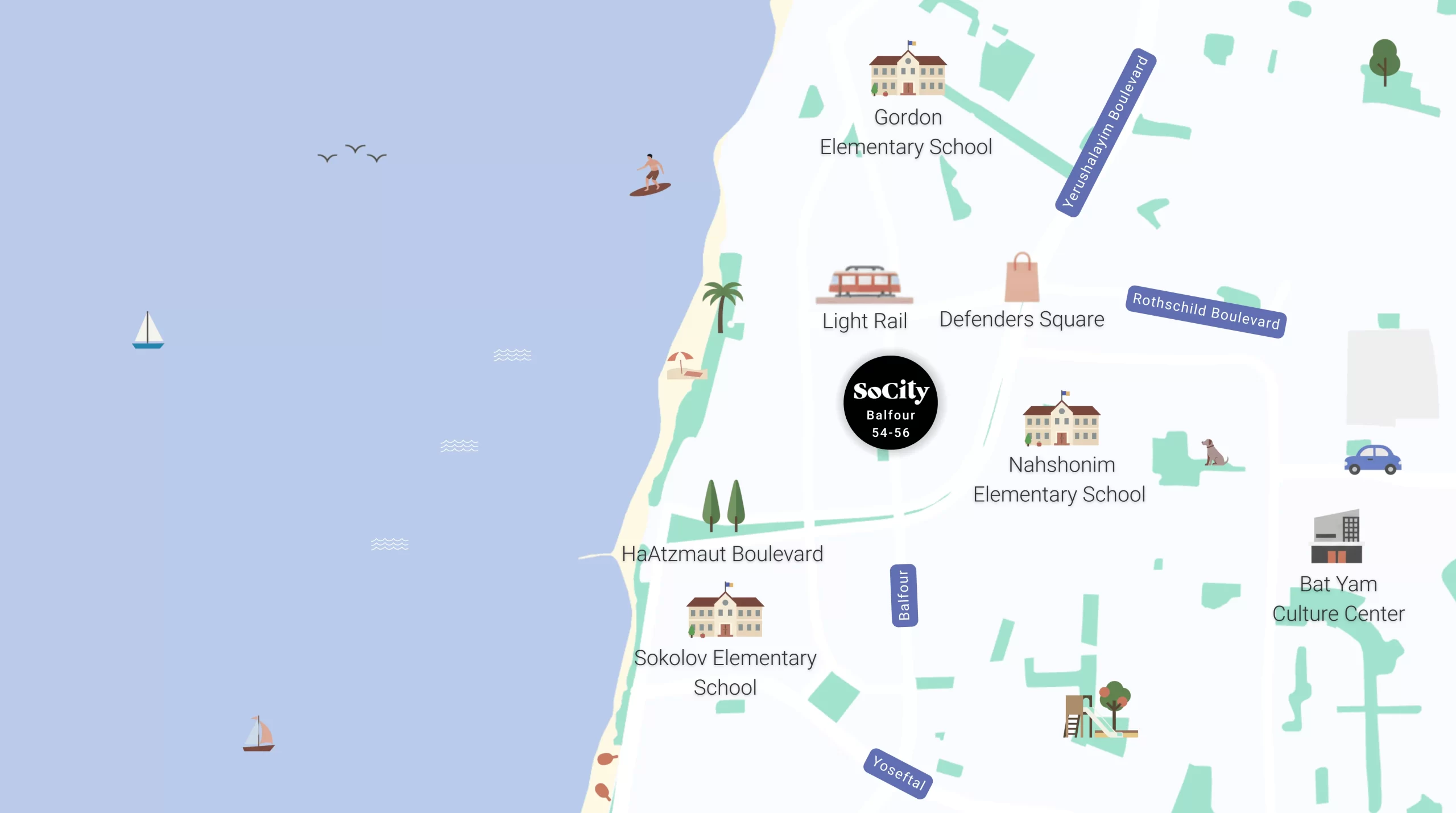 A rare location overlooking the promenade and the beach, close to commercial areas and the light rail. An ideal connection between urban energy and open space.